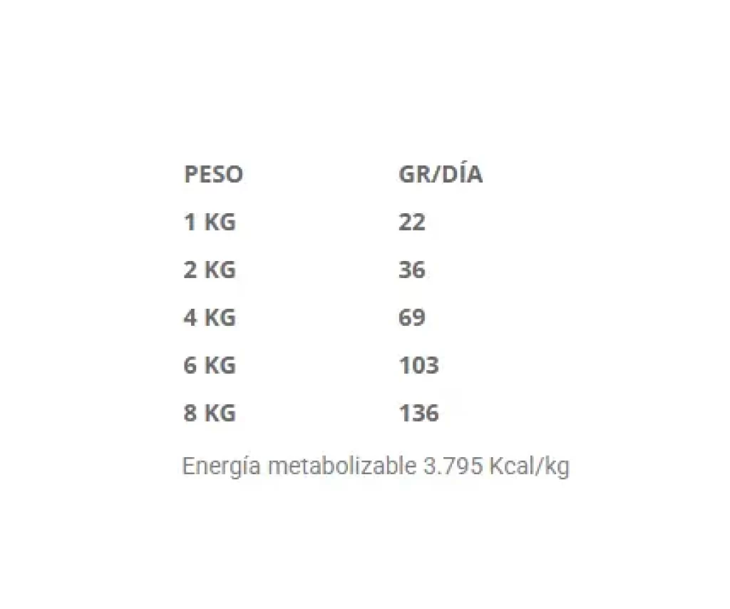 A continuación se explica en la tabla la cantidad de comida en gramos recomendada para su mascota en base a su peso: