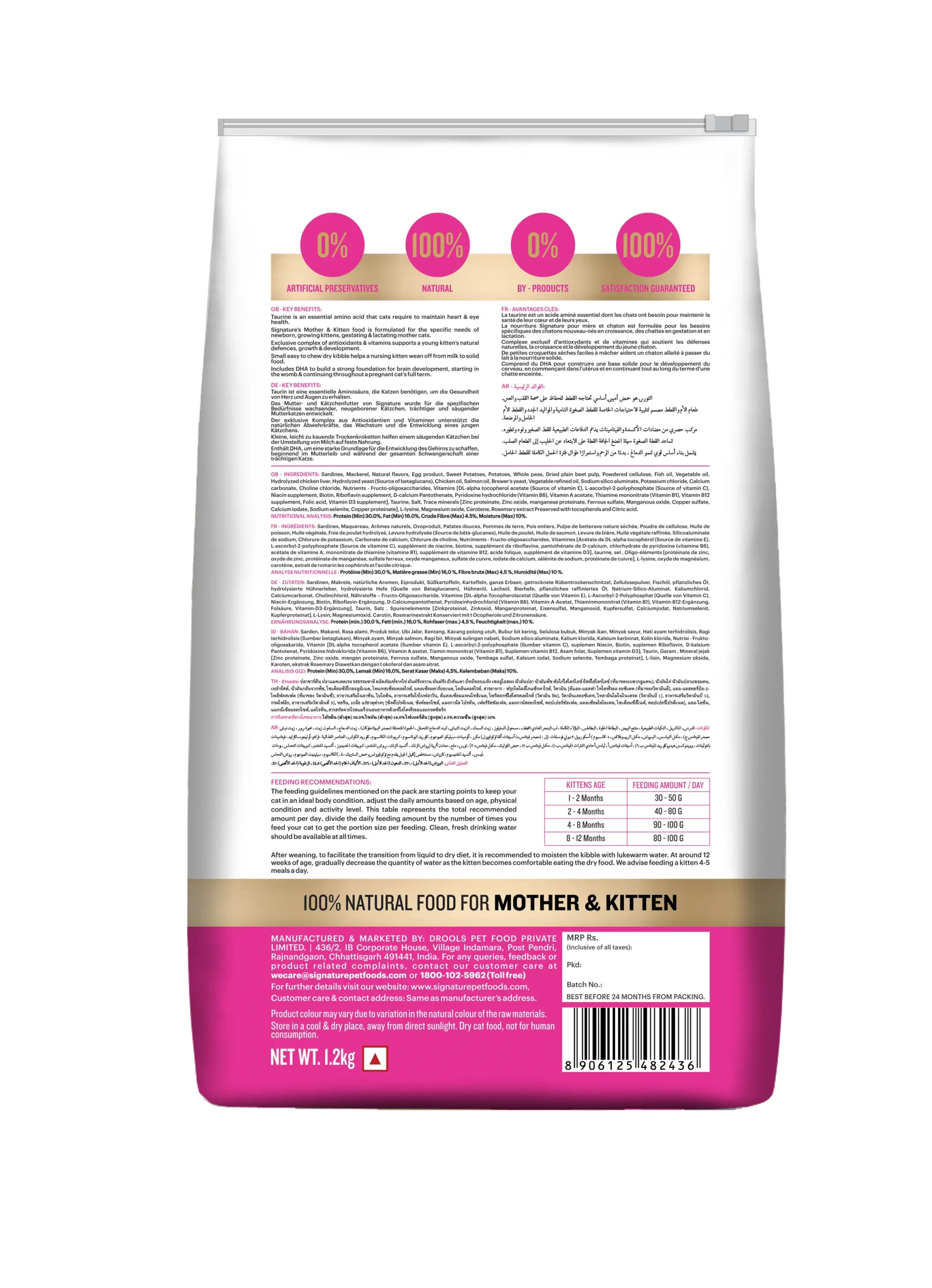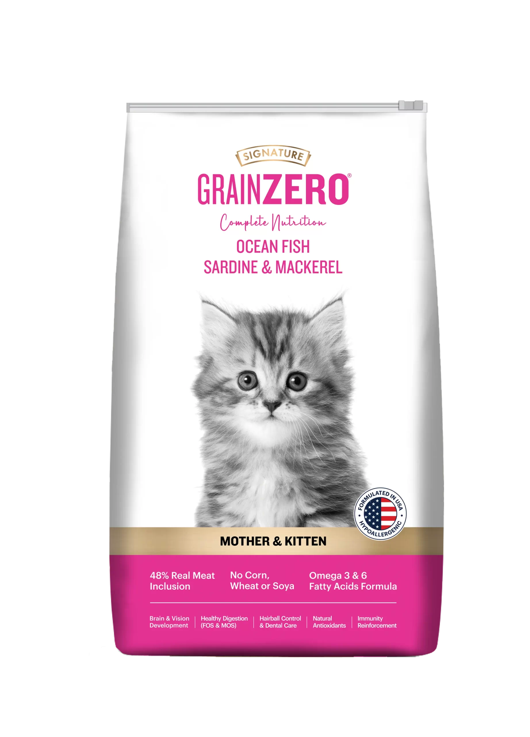 Grain Zero Kitten es un alimento hipoalergénico para gatitos y/o gatas en periodo de gestación. libre de granos y soja, con Omega 3 y 6, especial para el periodo de crecimiento. Con DHA y Taurina esenciales para el desarrollo cerebral, corazón y visión.
