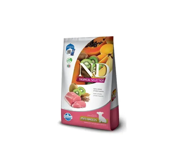 N&D Tropical Canino Puppy – Cerdo es un alimento seco completo para cachorros de razas pequeñas, formulado para cubrir las necesidades nutricionales de la etapa de crecimiento. Elaborado con carne de cerdo de alta calidad como fuente principal de proteínas, combinado con cereales integrales de absorción lenta (avena y cebada) y una mezcla única de frutas tropicales como plátano, papaya, kiwi y mango. Su perfil nutricional favorece el desarrollo muscular, la salud digestiva, el sistema inmune y la vitalidad en general.