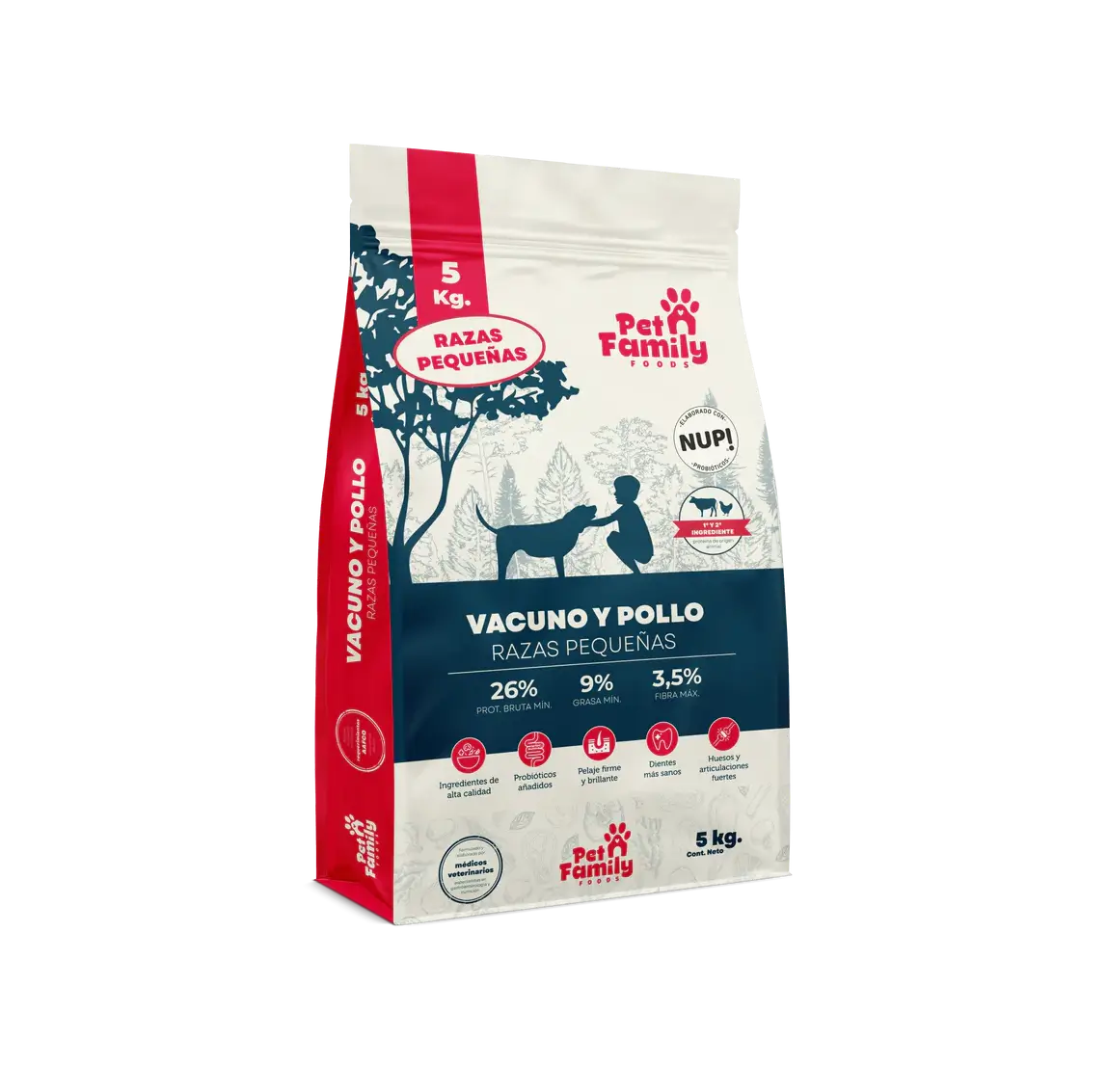 PetFamily Foods Adulto Vacuno y Pollo Razas Pequeñas alimento completo diseñado para perros de razas pequeñas, elaborado con carne fresca y alta proteína animal, con pellet pequeño y fácil de masticar, alimento con probióticos NUP! Pets para mejor digestión.