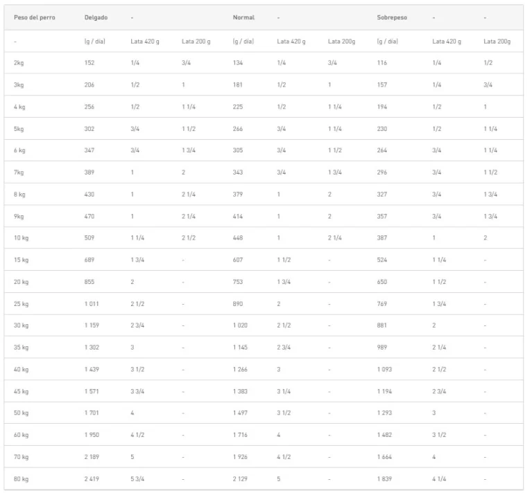 A continuación se explica en la tabla la cantidad de comida en gramos recomendada para su mascota en base a su peso y su edad: