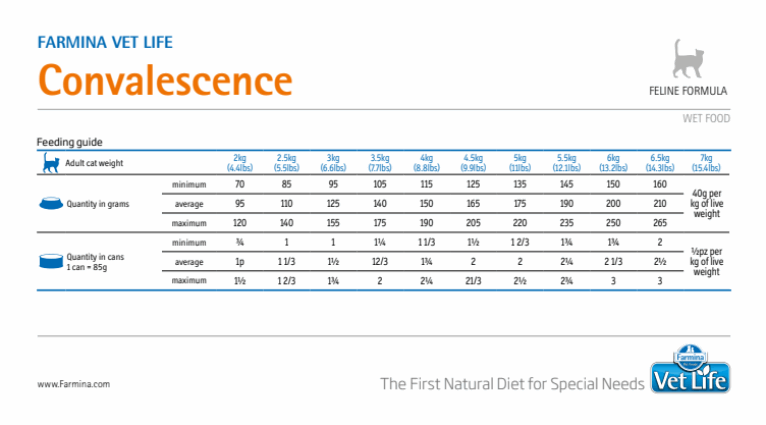 Vet Life Convalescence es un alimento dietético completo diseñado para apoyar la recuperación nutricional de gatos adultos. Está especialmente indicado para felinos debilitados por diversas enfermedades, ya sean específicas o generales. Se recomienda consultar con un veterinario antes de iniciar o prolongar su uso. Debe servirse a temperatura ambiente, respetando la cantidad diaria recomendada, y ofrecer siempre agua fresca. Su uso está pensado hasta lograr la recuperación total del gato.