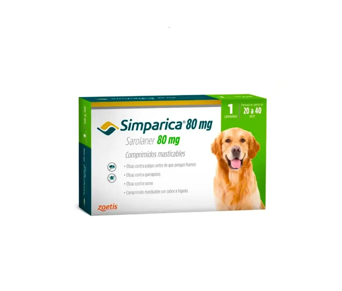 Zoetis Simparica 80 mg 1 Comp (20 a 40 kg) ofrece una nueva e innovadora forma de controlar las pulgas y las garrapatas al proporcionar actividad inmediata y persistente durante al menos 35 días, actuando más allá del período de tratamiento mensual.  Protege contra garrapatas, Pulgas y Sarna