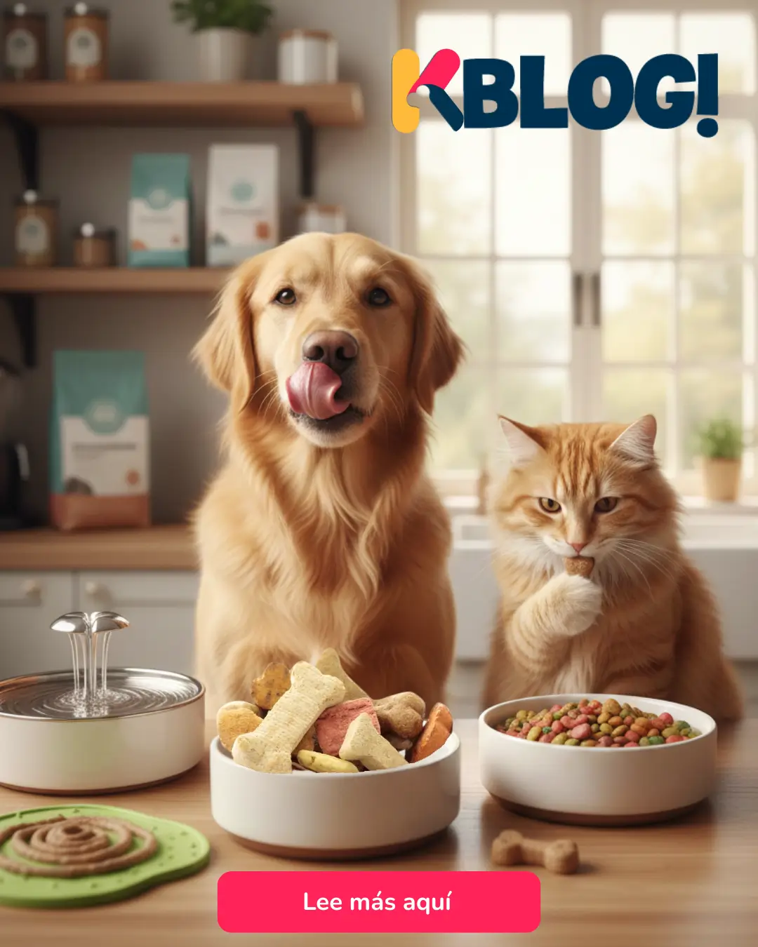 - Fuentes de agua: Para los gatos, que prefieren el agua en movimiento, considera el uso de fuentes automáticas.